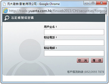 請點擊「忘記帳號|忘記密碼」連結,在彈出視窗中填入相關訊息並發送給元大證券(香港),元大證券(香港)的客戶服務專員會為閣下服務)。